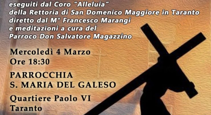 La parrocchia di Santa Maria del Galeso, al quartiere Paolo VI, questa sera, mercoledì 4, alle ore 18.30, terrà la solenne via crucis con i brani composti dal musicista francavillese padre Serafino Marinosci, che saranno eseguiti dal coro ‘Alleluja’ della rettoria di San Domenico, in Taranto.