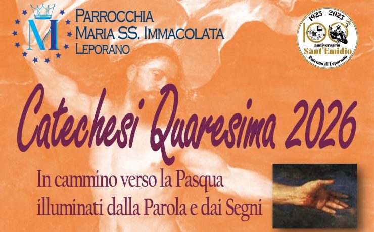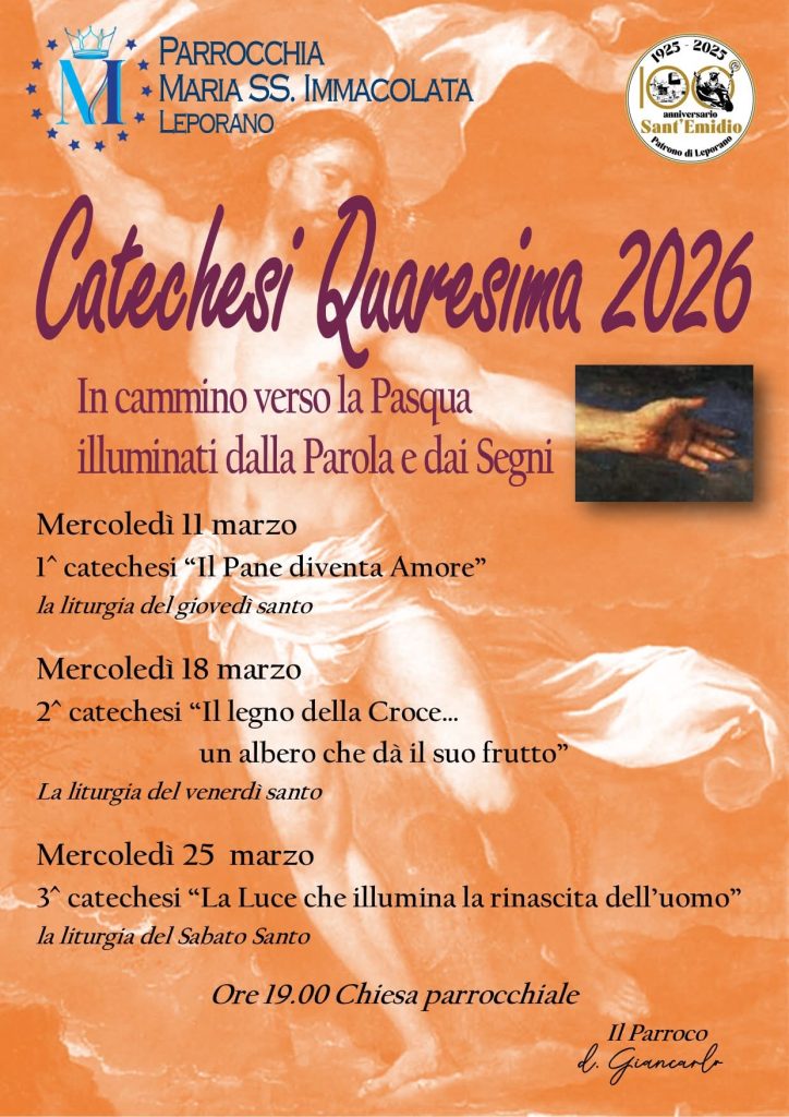 La parrocchia Maria Santissima Immacolata di Leporano terrà un ciclo di catechesi per la Quaresima dal titolo ‘In cammino verso la Pasqua illuminati dalla Parola e dai Segni’ a cura del parroco don Giancarlo Ruggieri, con inizio alle ore 19.