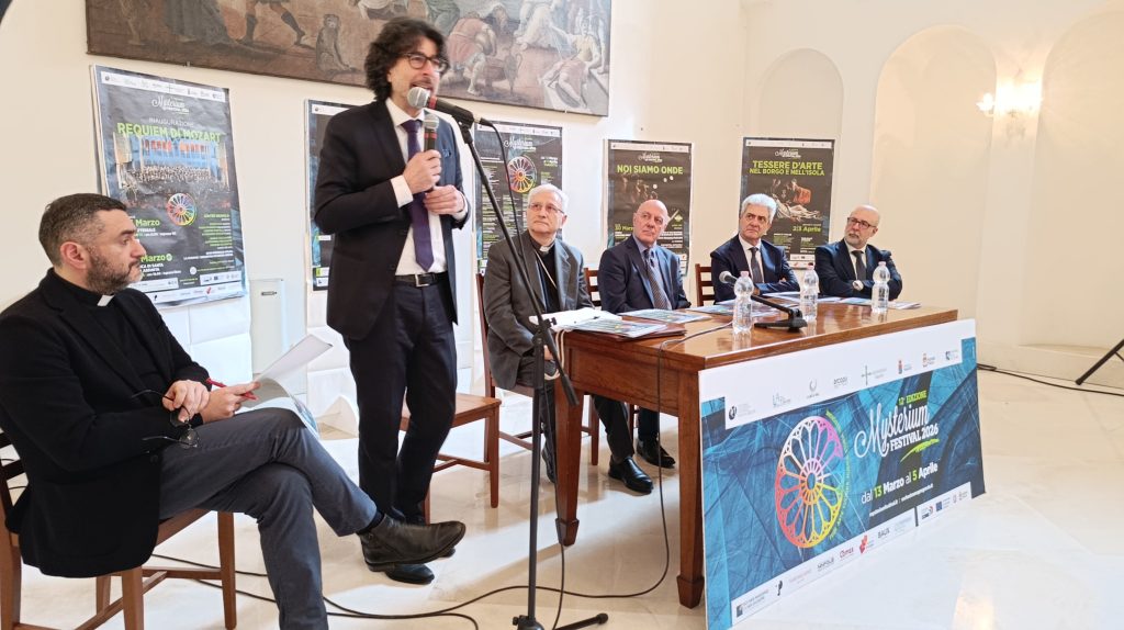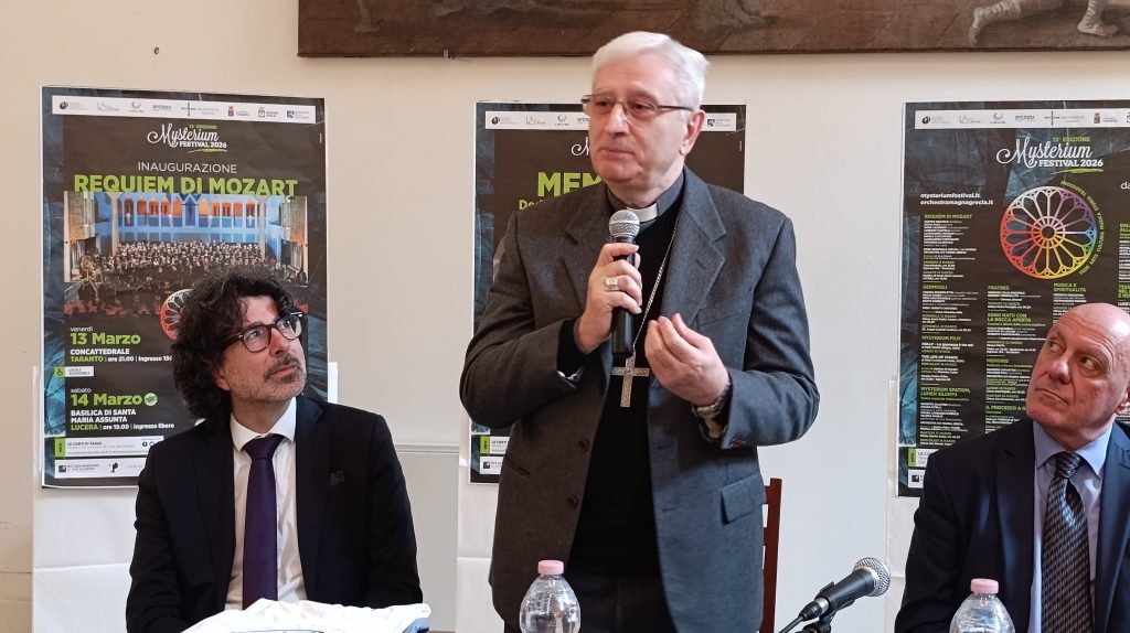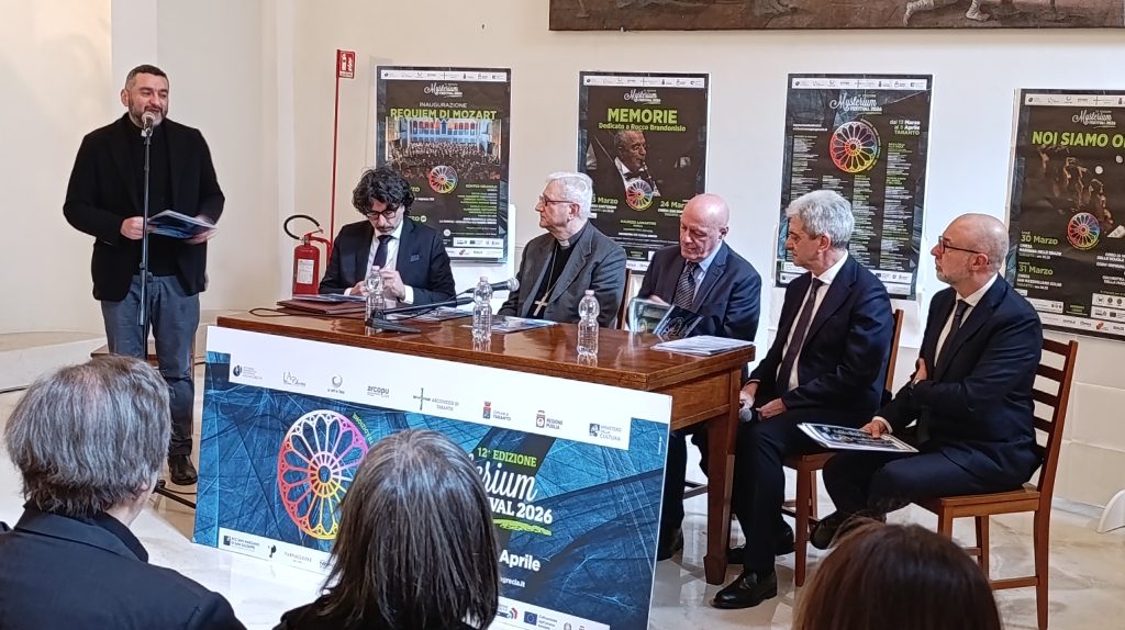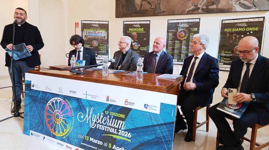 Questa mattina, lunedì 12, il programma della rassegna è stato presentato in arcivescovado nel corso di una conferenza stampa coordinata da mons. Emanuele Ferro (portavoce dell’arcidiocesi di Taranto). A illustrare i vari eventi sono stati Donato Fusillo (presidente del comitato scientifico del Festival), Pierfrancesco Semeraro, (direttore artistico del Mysterium), Piero Romano (direttore artistico dell’Ico Magna Grecia), Adriana Chirico (coordinatrice degli eventi nelle chiese), gli assessori comunali Maria Lucia Simeone (pubblica istruzione) e Gianni Cataldino (coordinamento strategico delle azioni di governo), l’amm. di squadra Andrea Petroni e l’arcivescovo mons. Ciro Miniero.