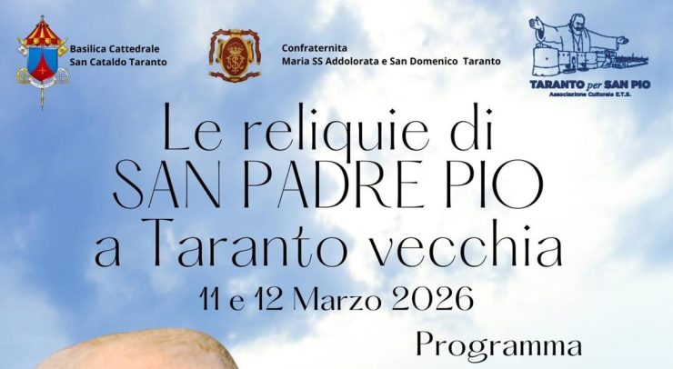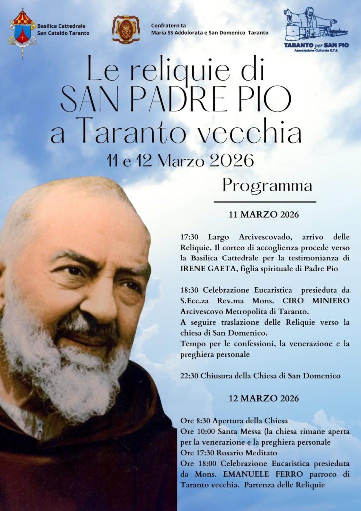 Tutto è pronto in città vecchia per l’arrivo delle reliquie di San Pio. Queste giungeranno mercoledì 11 marzo alle ore 17.30 in largo arcivescovado per essere poi portate processionalmente nella basilica cattedrale di San Cataldo dove Irene Gaeta, figlia spirituale del frate stimmatizzato, terrà una testimonianza. Seguirà alle ore 18.30 la celebrazione eucaristica presieduta dall’arcivescovo mons. Ciro Miniero. Al termine le reliquie verranno traslate nella chiesa di San Domenico, con un tempo per le Confessioni, la venerazione e la preghiera personale; la chiesa eccezionalmente resterà aperta fino alle ore 22.30.