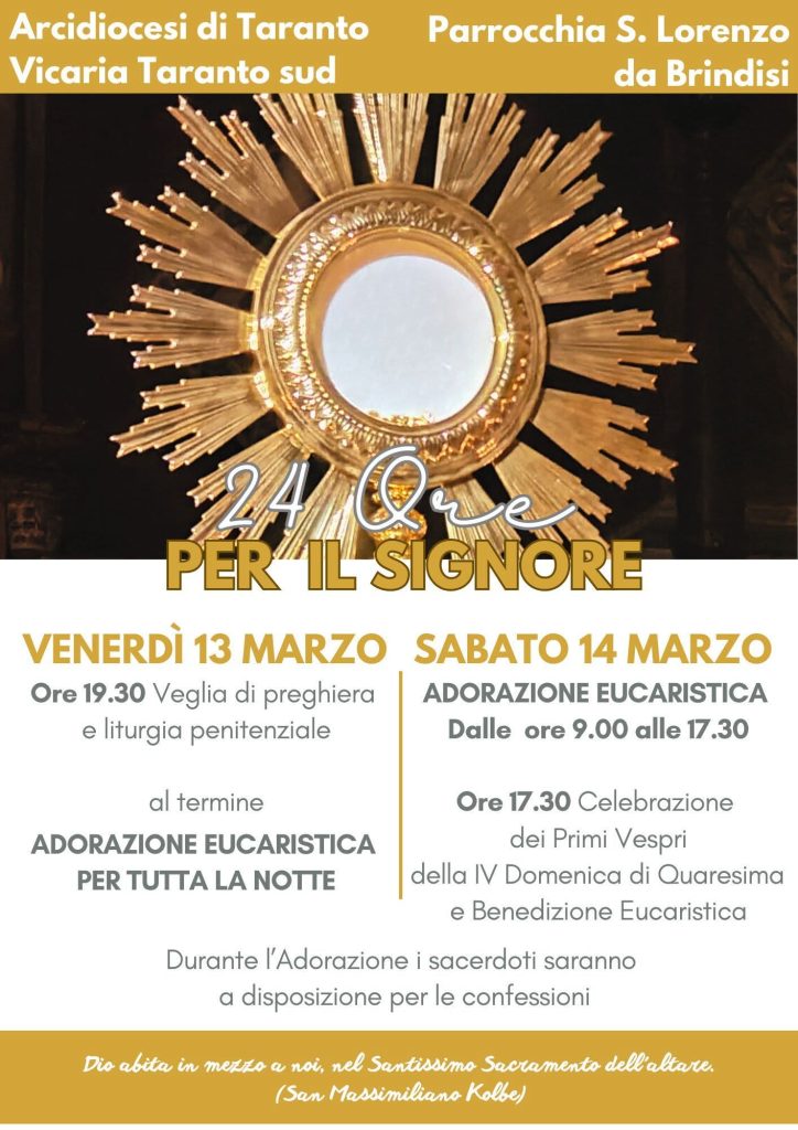 Venerdì 13 e sabato 14 marzo la vicaria Taranto sud terrà nella parrocchia di San Lorenzo da Brindisi dei frati cappuccini, in viale Magna Grecia, l’adorazione eucaristica continuata intitolata ‘24 Ore per il Signore’. S’inizierà alle ore 19.30 con la veglia di preghiera e la liturgia pentenziale; al termine l’adorazione eucaristica continuerà per tutta la notte, con la chiesa che resterà aperta ininterrottamente.