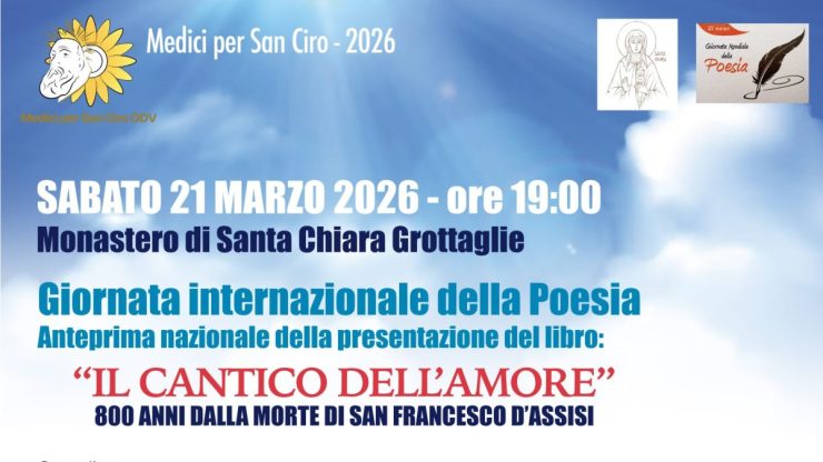 In anteprima nazionale, al monastero delle Clarisse di Grottaglie, il 21 marzo alle ore 19, in occasione della Giornata internazionale della poesia, sarà presentato il volume ‘Il Cantico dell’amore di San Francesco d’Assisi’.