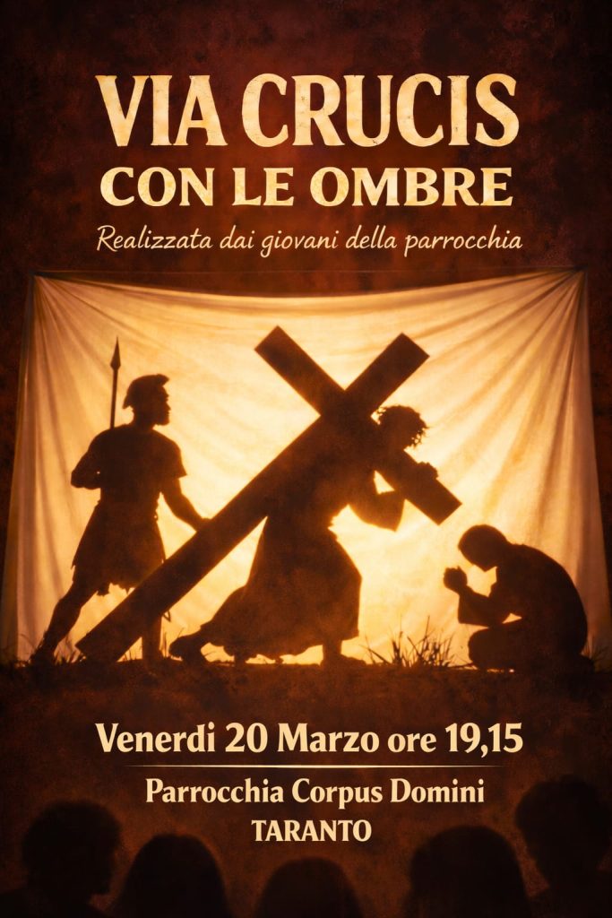 Venerdì 20 marzo, alle ore 19.15, nella chiesa del Corpus Domini di Taranto (quartiere Paolo VI) si svolgerà una suggestiva via crucis con le ombre in un momento particolare di preghiera e riflessione che accompagnerà la comunità nel cammino quaresimale.