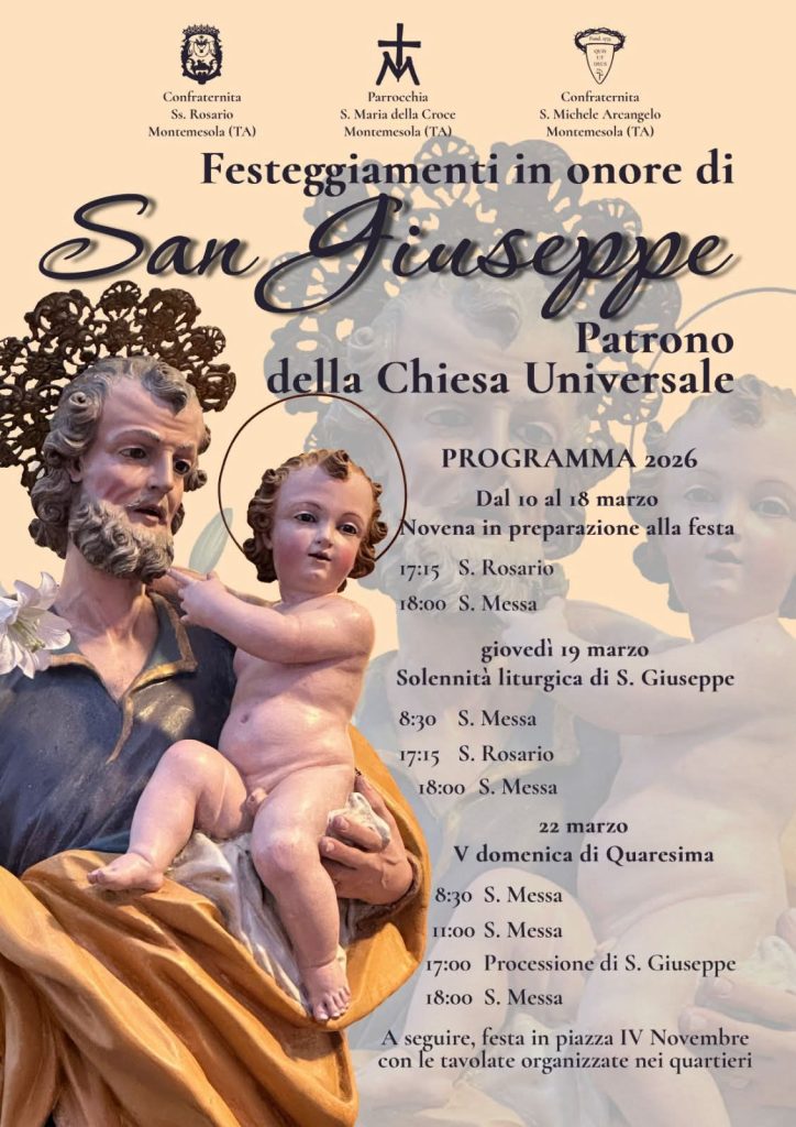 La parrocchia Santa Maria della Croce e le confraternite del santo rosario e di San Michele Arcangelo domenica 22 marzo festeggeranno San Giuseppe.