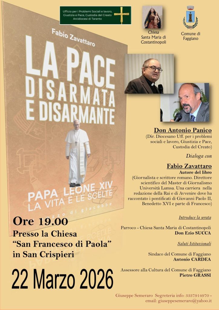 Il noto giornalista e scrittore Fabio Zavattaro domenica 22 marzo sarà a San Crispieri nel Comune di Faggiano per presentare il suo ultimo libro ‘La pace disarmata e disarmante. papa Leone XIV – La vita e le scelte’, edito da il Pozzo di Giacobbe. L’evento, che si svolgerà nella chiesa  di San Francesco di Paola alle ore 19, è stato organizzato dall’ufficio per i Problemi sociali e lavoro, Giustizia e pace, Custodia del Creato dell’arcidiocesi di Taranto, in collaborazione con la chiesa di Santa Maria di Costantinopoli e il Comune di Faggiano.