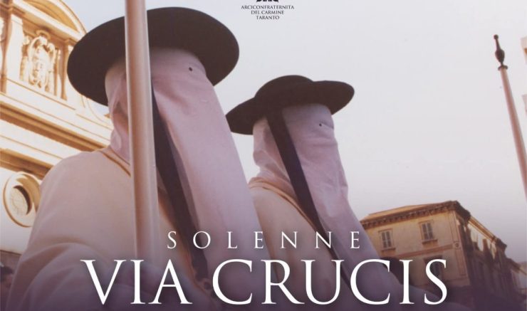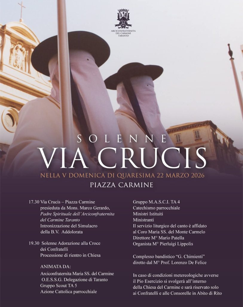 Come avviene ormai da qualche anno l’arciconfraternita del Carmine di Taranto terrà in piazza Carmine la solenne via crucis dell’ultima Domenica di Quaresima, 22 marzo. La funzione, alle ore 17.30, sarà presieduta dal padre spirituale mons. Marco Gerardo e inizierà con l’intronizzazione del simulacro della Beata Vergine Addolorata. Al termine, solenne adorazione alla croce da parte delle coppie di confratelli in abito di rito, precedute dalla ‘troccola’, e processione di rientro in chiesa.