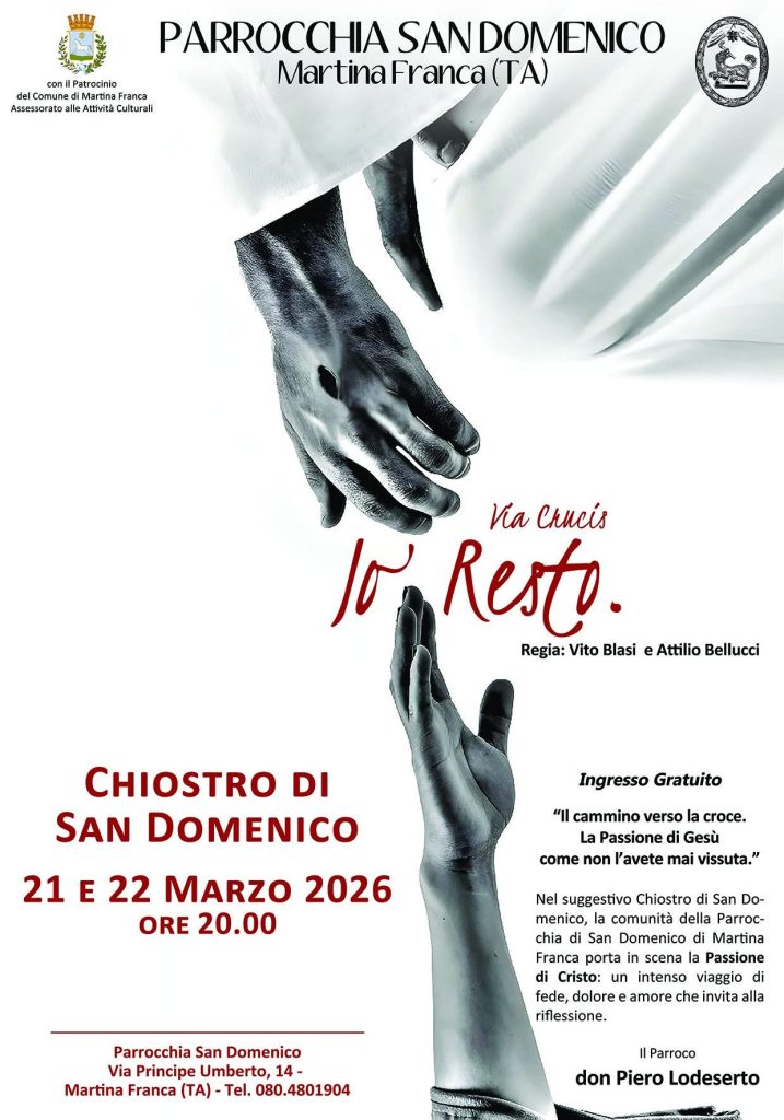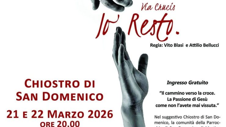 ‘Io resto’ è il titolo dell’originale Via Crucis, per la regia di Vito Blasi e Attilio Bellucci, che si terrà sabato 21 e domenica 22 marzo, con inizio alle ore 20, nel suggestivo chiostro di San Domenico, a Martina Franca. A cura della omonima comunità parrocchiale, andrà in scena la Passione di Cristo in un intenso viaggio di fede, dolore e amore che invita alla riflessione. “Il cammino verso la croce. La Passione di Gesù come non l’avete mai vissuta”,  è l’invito alla partecipazione da parte del parroco, don Piero Lodeserto.