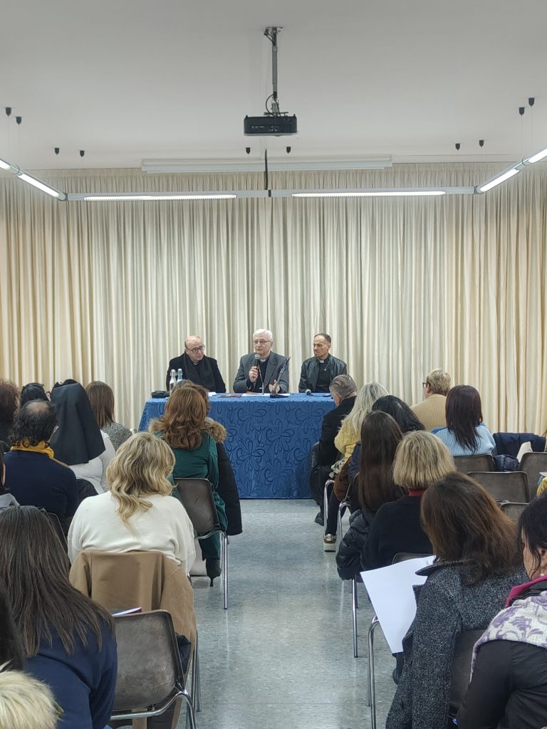 L’appuntamento annuale per il corso di aggiornamento degli insegnanti di religione cattolica si è concentrato sul tema della costruzione dell’intelligenza spirituale. La scelta di questo tema è legata al 60° anniversario della lettera di papa Leone XIV sulla ‘Gravissimum Educationis’, la quale invita la comunità a sviluppare tre impegni principali: la cura dell’interiorità, l’accompagnamento nell’uso del digitale e la promozione della pace. Nelle giornate del 9-10-11 marzo, al seminario arcivescovile, oltre 100 insegnanti di religione si sono messi in ascolto degli esperti e hanno potuto avere del tempo a disposizione per il confronto e l’incontro. Il corso ha approfondito i vari aspetti attraverso interessanti contributi. Il professor Mancini ha analizzato le sfide educative del post-umano, mettendo al centro la cura dell’interiorità per aiutare gli studenti a riscoprire i propri desideri autentici e la speranza, sottraendosi ai bisogni indotti dal contesto culturale. Il professor Sebastiano Pinto, docente di Sacra Scrittura, partendo dal libro dei Proverbi, ha illustrato il cammino di ricerca interiore tra tecnica e sapienza, sottolineando l’importanza per l’uomo di riconoscersi come creatura davanti a Dio. Il professor Vincenzo Annicchiarico ha fornito una definizione di intelligenza spirituale intesa come la cura di sé nelle relazioni, mettendo a fuoco il concetto paolino di Hypomene (pazienza), ovvero la capacità di rimanere fermi e stabili anche sotto il peso delle avversità della vita. La professoressa Silvia Ruggiero, psicologa, ha esaminato il rapporto tra mondo interiore ed esteriore per sviluppare ulteriormente questa dimensione di cura.