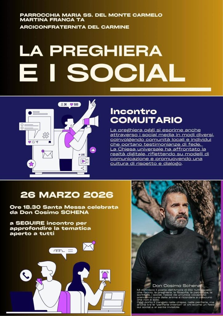 ‘La preghiera e i social’ è il tema della serata che si terrà stasera, giovedì 26 marzo, alla parrocchia del Carmine di Martina in collaborazione con l’arciconfraternita omonima. Ne parlerà don Cosimo Schena, dopo la santa messa che sarà da lui celebrata alle ore 18.30, in un incontro aperto a tutti. La preghiera oggi si esprime anche attraverso i social media in modi diversi, coinvolgendo comunità locali e individui che portano testimonianze di fede. La Chiesa universale ha affrontato la realtà digitale, riflettendo su modelli di comunicazione e promuovendo una cultura di rispetto e dialogo.