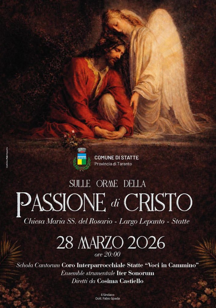 Sabato 28 alle ore 20, a Statte, a cura dell’amministrazione comunale, su Largo Lepanto (di fronte alla parrocchia della Madonna del Rosario) avrà luogo l’iniziativa ‘Sulle orme della Passione di Cristo’, Interverranno la schola cantorum-coro interparrocchiale di Statte ‘Voci in cammino’ e l’ensemble strumentale ‘Iter Sonorum’ diretti da Cosima Castiello.