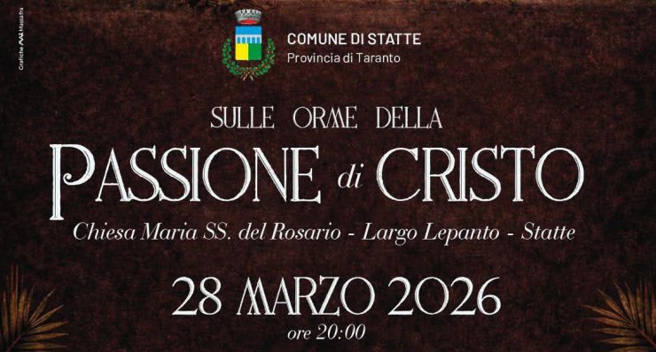 Sabato 28 alle ore 20, a Statte, a cura dell’amministrazione comunale, su Largo Lepanto (di fronte alla parrocchia della Madonna del Rosario) avrà luogo l’iniziativa ‘Sulle orme della Passione di Cristo’, Interverranno la schola cantorum-coro interparrocchiale di Statte ‘Voci in cammino’ e l’ensemble strumentale ‘Iter Sonorum’ diretti da Cosima Castiello.