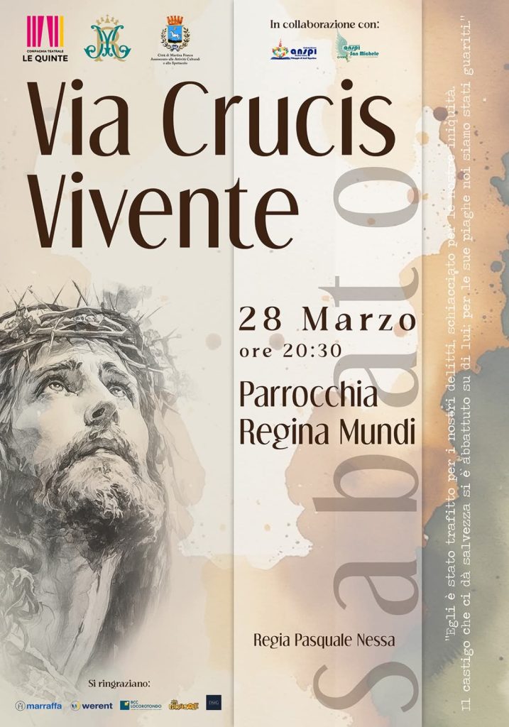 A Martina Franca la parrocchia della Regina Mundi (guidata da don Martino Mastrovito) in collaborazione con Anspi Villaggio Sant’Agostino e Anspi San Michele e il patrocinio del Comune, oggi, lunedì 30 marzo alle ore 20.30 a seguito del rinvio di sabato per le avverse condizioni meteo.