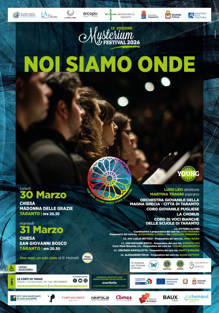 Oggi, lunedì 30, alle 20.30 nella chiesa Madonna delle Grazie, e domani, martedì 31 marzo, alla stessa ora, nella chiesa San Giovanni Bosco, per la dodicesima edizione del Mysterium Festival, in programma ‘Noi siamo onde’, progetto generato da ‘Due mari, un solo cielo’, nuova commissione affidata al m° Roberto Molinelli in prima esecuzione assoluta. Con l’Orchestra giovanile della Magna Grecia – Città di Taranto, diretta dal m° Luigi Leo, il soprano Martina Tragni, il Lucania Apulia Chorus, il Coro giovanile pugliese, il Coro voci bianche delle scuole di Taranto.