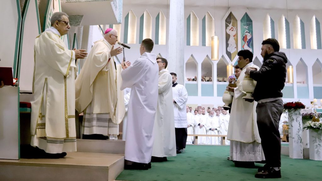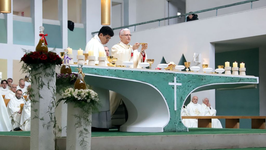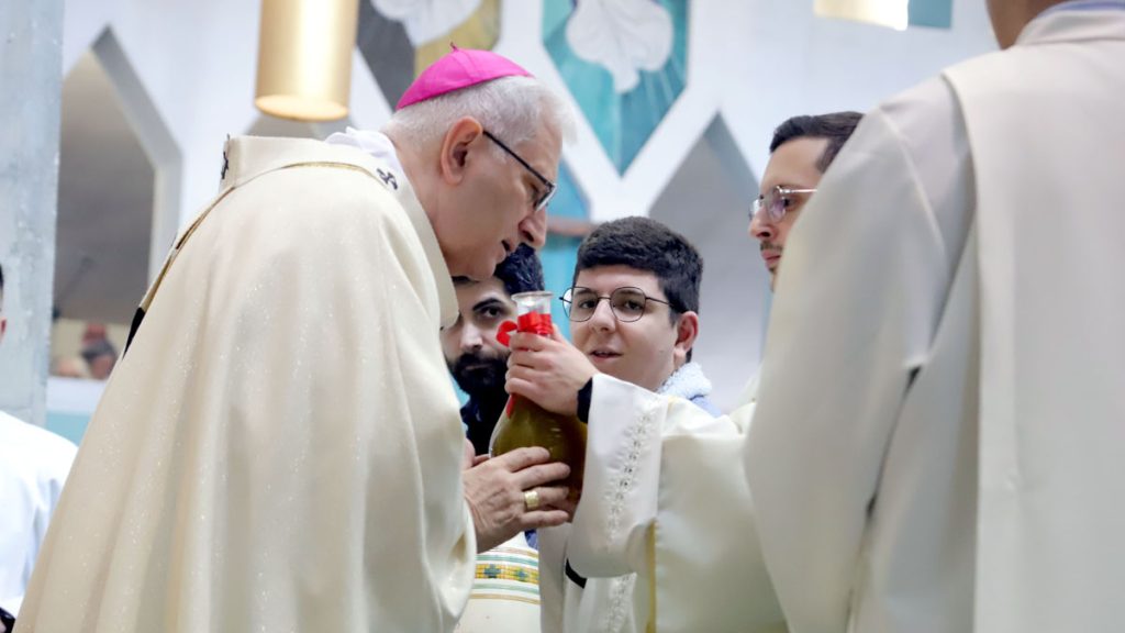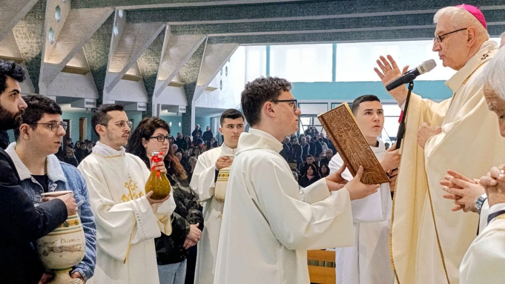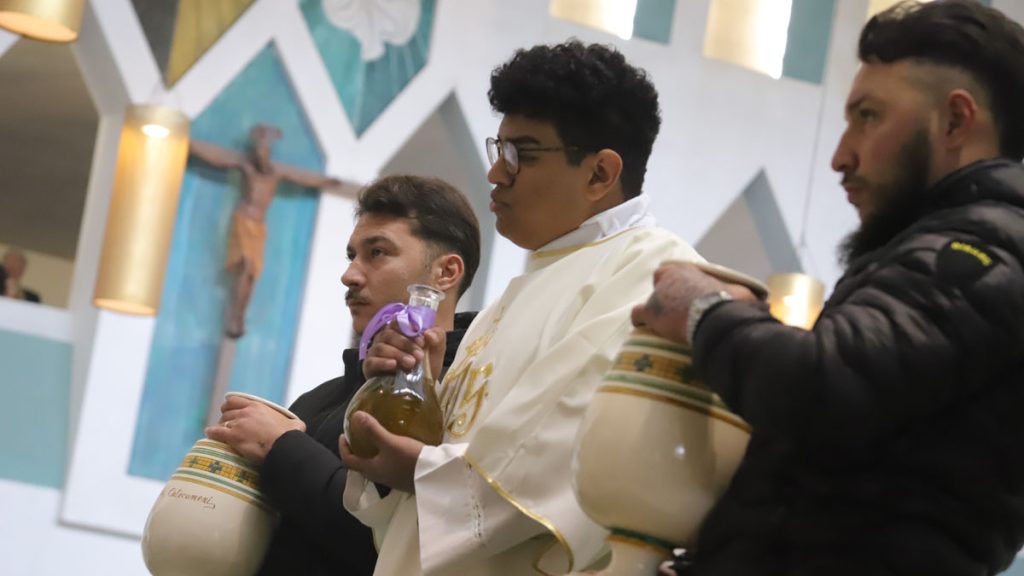Nel corso della santa messa sono stati benedetti i santi olii  per la celebrazione dei sacramenti nel corso dell’anno, consegnati poi ai parroci perché li introducano nelle loro parrocchie, segno della grazia sacramentale donata alle nostre comunità. Precedentemente gli olii sono stati portati all’altare da alcune persone appositamente designate e dai diaconi; per l’olio degli infermi ci sono stati un infermiere e una dama dell’Unitalsi; per gli olii dei catecumeni e del crisma, alcuni catecumeni che riceveranno l‘iniziazione cristiana; l’offertorio con il pane e il vino è stato fatto da due famiglie della diocesi.