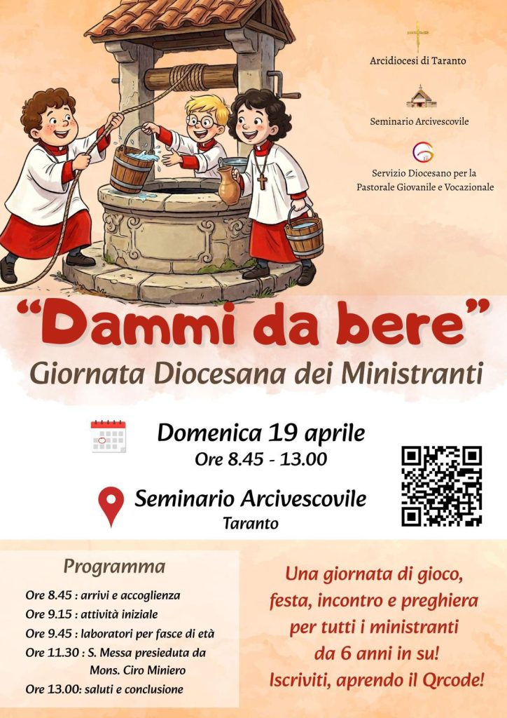 Tema dell’incontro sarà “Dammi da bere!”, espressione tratta dal Vangelo dell’incontro tra Gesù e la Samaritana (Gv 4,1-42). Questo brano evangelico sta già accompagnando il percorso annuale proposto dalla pastorale giovanile e vocazionale della diocesi: la giornata dei ministranti si inserisce quindi in un cammino già avviato, offrendo ai ragazzi l’opportunità di approfondirlo e viverlo in modo concreto e condiviso. I ministranti saranno guidati a riflettere con semplicità sul tema della sete, intesa come desiderio profondo che abita il cuore di ciascuno e riletta in modo differenziato secondo le varie fasce di età.