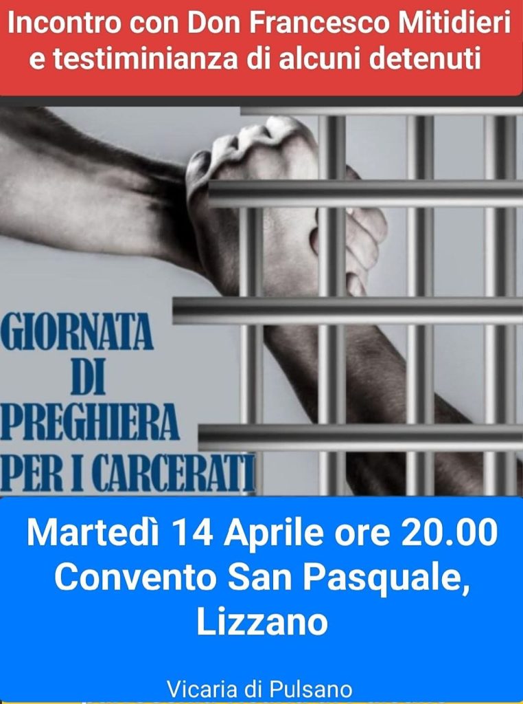 La ‘Giornata di preghiera per i carcerati’ si terrà martedì 14 aprile alle ore 20 a Lizzano nel convento di San Pasquale Baylon e prevede l’incontro con il cappellano penitenziario don Francesco Mitidieri e la testimonianza di alcuni detenuti.
