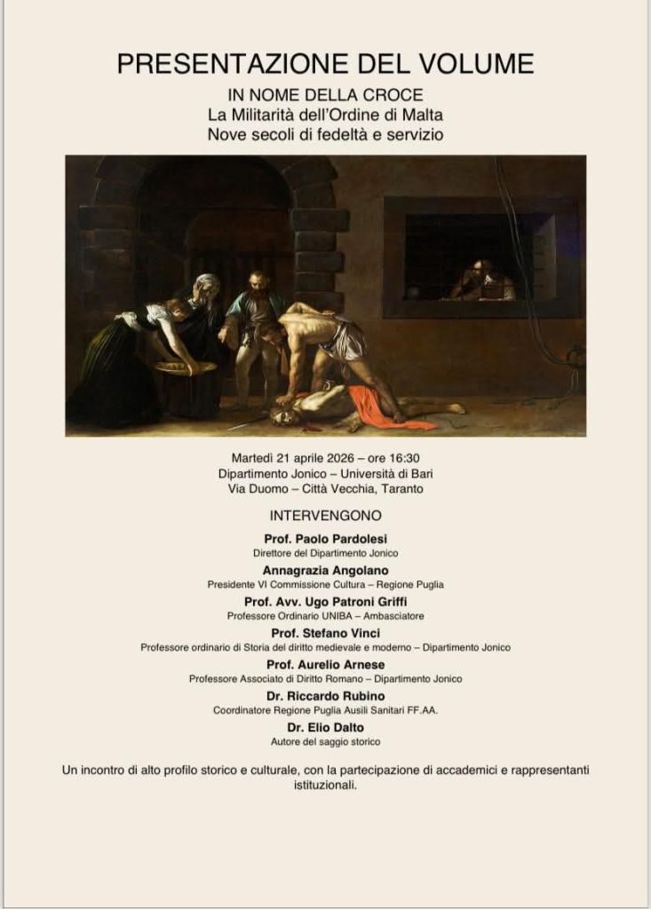 ‘In nome della Croce-La militarità dell’Ordine di Malta, nove secoli di fedeltà e servizio’’ è il titolo del volume di Elio Dalto che sarà presentato martedì 21 aprile alle ore 18.30 nel salone del Dipartimento jonico dell’Università di Bari, in via Duomo.