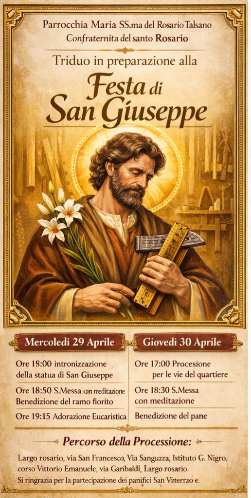 Mercoledì 29 aprile alle ore 18 ci sarà l’intronizzazione del simulacro di San Giuseppe; alle ore 18.30, santa messa con meditazione sul tema ‘Il lavoro come via di pace’ e benedizione del ramo fiorito (una tradizione che si richiama il valore di giustizia e santità di san Giuseppe rappresentato dal bastone fiorito del santo); alle ore 19.15, adorazione eucaristica.